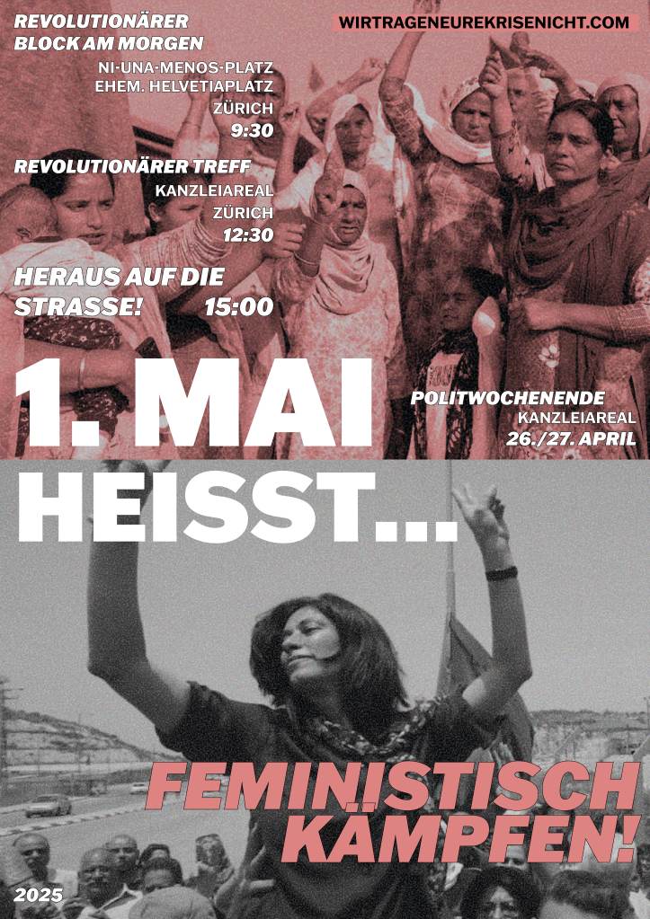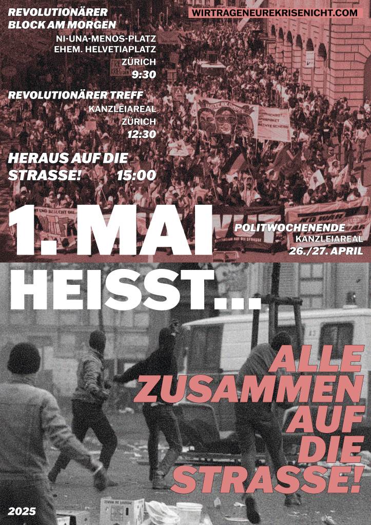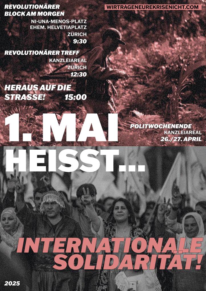 Der Erste Mai ist seit bald 140 Jahren der internationale Kampftag der arbeitenden Klasse und unterdrückten Völker. Es ist ein Tag, der Hoffnung macht in finsteren Zeiten. Ein Tag im Zeichen der weltweiten Kämpfe gegen Ausbeutung und Unterdrückung, ein Tag, der Perspektiven jenseits des Kapitalismus fassbar macht. Ein Tag, an dem wir gemeinsam Kraft schöpfen, für die Kämpfe, die uns bevorstehen. Es ist der Tag, an dem die vielen internationalen Kämpfe von Rojava, über Palästina, Argentinien, Iran bis hier nach Zürich auf der Strasse zusammenkommen.