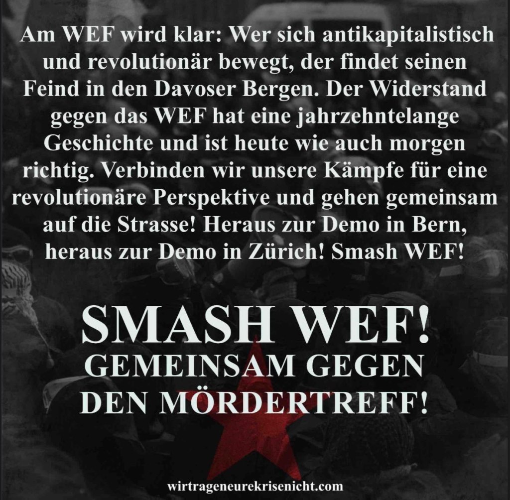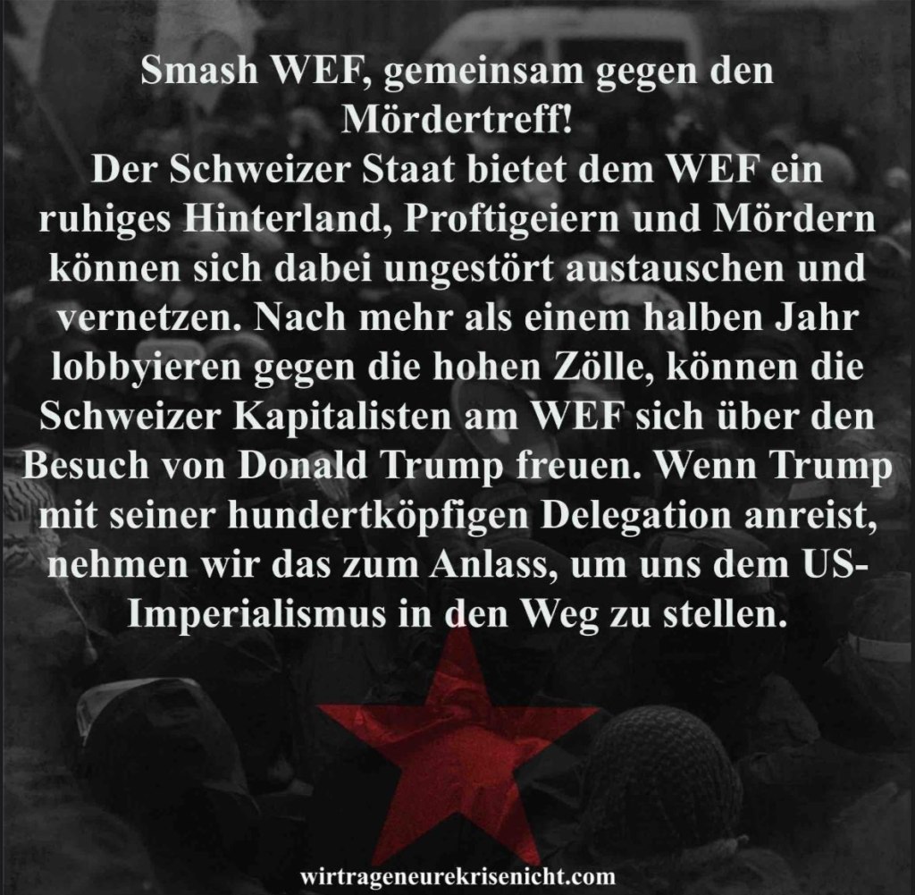 Nach mehr als einem halben Jahr lobbyieren gegen die hohen Zölle, können die Schweizer Kapitalisten am WEF sich über den Besuch von Donald Trump freuen. Wenn Trump mit seiner hundertköpfigen Delegation anreist, nehmen wir das zum Anlass, um uns dem US-Imperialismus in den Weg zu stellen. Wenn der türkische Staat Minister schickt, um Handelsverträge abzuschliessen, dann solidarisieren wir uns mit Rojava und allen, die den reaktionären türkischen Staat angreifen. Wenn der israelische Staat seine “innovativen” Rüstungsfirmen schickt, dann greifen wir diese an und solidarisieren uns mit dem palästinensischen Volk und seinem Widerstand. Wenn Bundesrat Cassis und Keller-Suter in den Davoser Bergen heuchlerisch Hände schütteln, um die Diplomatie zu pflegen, dann kämpfen wir umso entschlossener für eine Gesellschaft, in der nicht ihr Profit im Zentrum steht, sondern die Freiheit aller Unterdrückten. Am WEF wird klar: Wer sich antikapitalistisch und revolutionär bewegt, der findet seinen Feind in den Davoser Bergen.