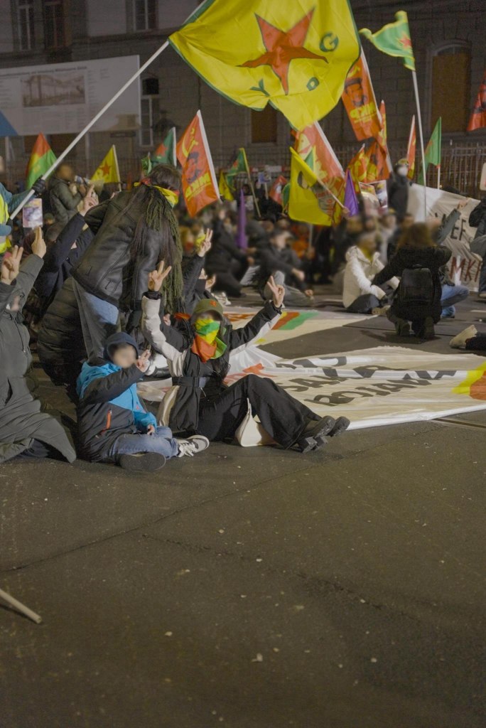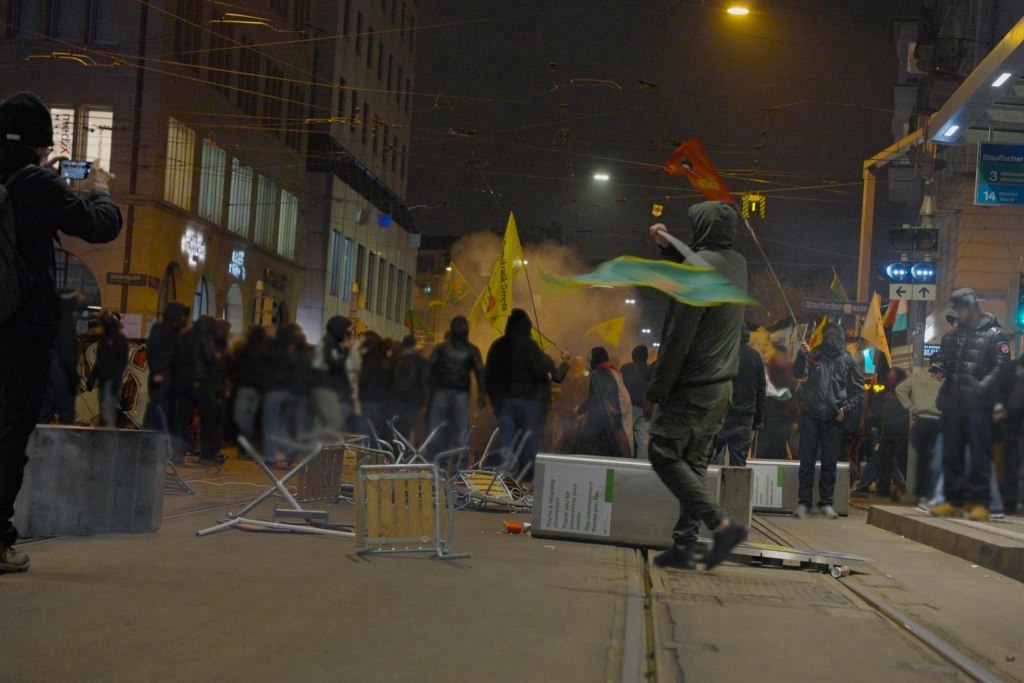 Im Anschluss der Demonstration kam es zu einer weiteren selbstbestimmten Demonstration mit einer Platzbesetzung, getragen von der kurdischen Freiheitsbewegung zusammen mit revolutionären Kräften. Nach den Angriffen der dschihadistischen Kräfte angeführt von HTS und Al-Jolani auf die kurdischen Staddteile Aleppos, greifen sie nun auch Rojava an. Die anschliessende spontane Mobilisierung unterstreicht die Dringlichkeit, mit welcher es sich jetzt zu organisieren gilt. Die kurdische Freiheitsbewegung und speziell das revolutionäre Projekt Rojava müssen jetzt unterstützt und verteidigt werden. So wurde die Kasernenstrasse über eine Stunde besetzt und erst als die Bullen massiv Tränengas, Gummischrot sowie Wasserwerfer einsetzte, bewegten sich die Massen über den Stauffacher zurück zum Ni-Una-Menos-Platz (ehem. Helvetiaplatz). Trotz dieser Eskalation der Bullen verteidigte sich die kämpferische Demonstration und löste sich selbstbestimmt auf.