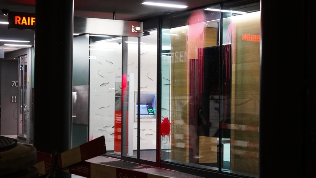 Der revolutionäre Block der Demonstration war geprägt von selbstbestimmter Stimmung und Solidarität mit den kämpfenden Völkern weltweit. So gab es Interventionen gegen den imperialistischen Einmarsch der USA in Venezuela, vor dem gehängten Transparent wurde am Limmatquai die Flagge der Imperialisten verbrannt. Weiter gab es entlang der Route Farbangriffe gegen verschiedene Banken wie Raiffeisen, Crédit Agricole und UBS sowie den Nespresso Laden und das TX Gebäude. Gründe dafür finden sich viele. Alle sind sie Mitglied der illustren Liste der strategischen Partner des WEF. Die TX-Gruppe verklärt Femizide als Einzelfälle und begeht so Täter-Opfer Umkehr. Gezielt wurde auch der Laden der Automarke Cadillac an der Bahnhofstrasse angegriffen. Die Luxusautomarke stellt die Auto-Flotte des US-Präsidenten. Donald Trump lässt sich auch im extra eingeflogenen Cadillac in Davos herumkutschieren.