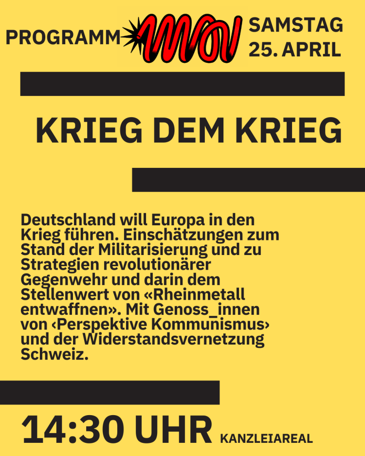 Deutschland will Europa in den Krieg führen. Einschätzungen zum Stand der Militarisierung und zu Strategien revolutionärer Gegenwehr und darin dem Stellenwert von «Rheinmetall entwaffnen». Mit Genoss_innen von ‹Perspektive Kommunismus› und der Widerstandsvernetzung Schweiz.