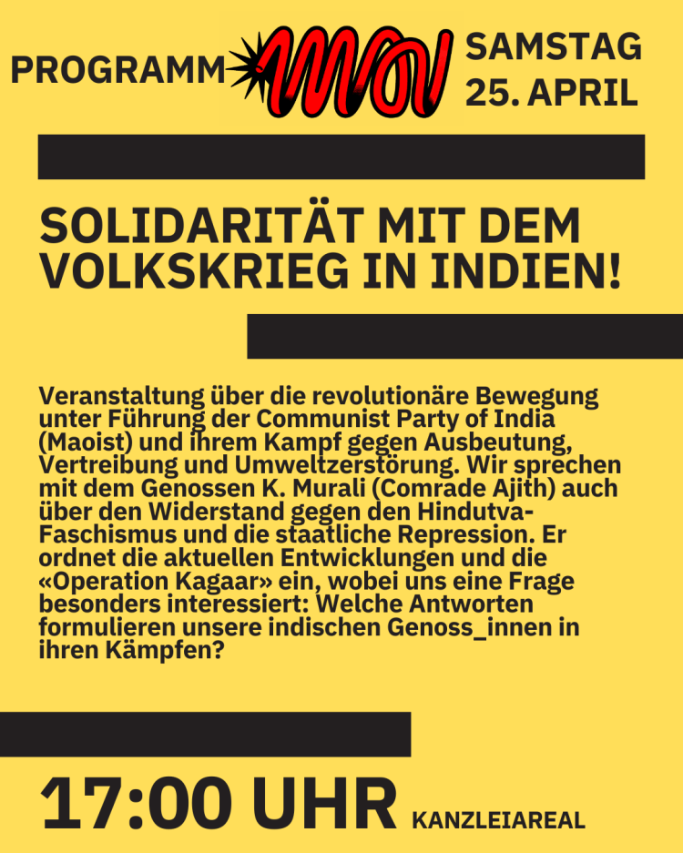 Veranstaltung über die revolutionäre Bewegung unter Führung der Communist Party of India (Maoist) und ihrem Kampf gegen Ausbeutung, Vertreibung und Umweltzerstörung. Wir sprechen mit dem Genossen K. Murali (Comrade Ajith) auch über den Widerstand gegen den Hindutva-Faschismus und die staatliche Repression. Er ordnet die aktuellen Entwicklungen und die «Operation Kagaar» ein, wobei uns eine Frage besonders interessiert: Welche Antworten formulieren unsere indischen Genoss_innen in ihren Kämpfen?