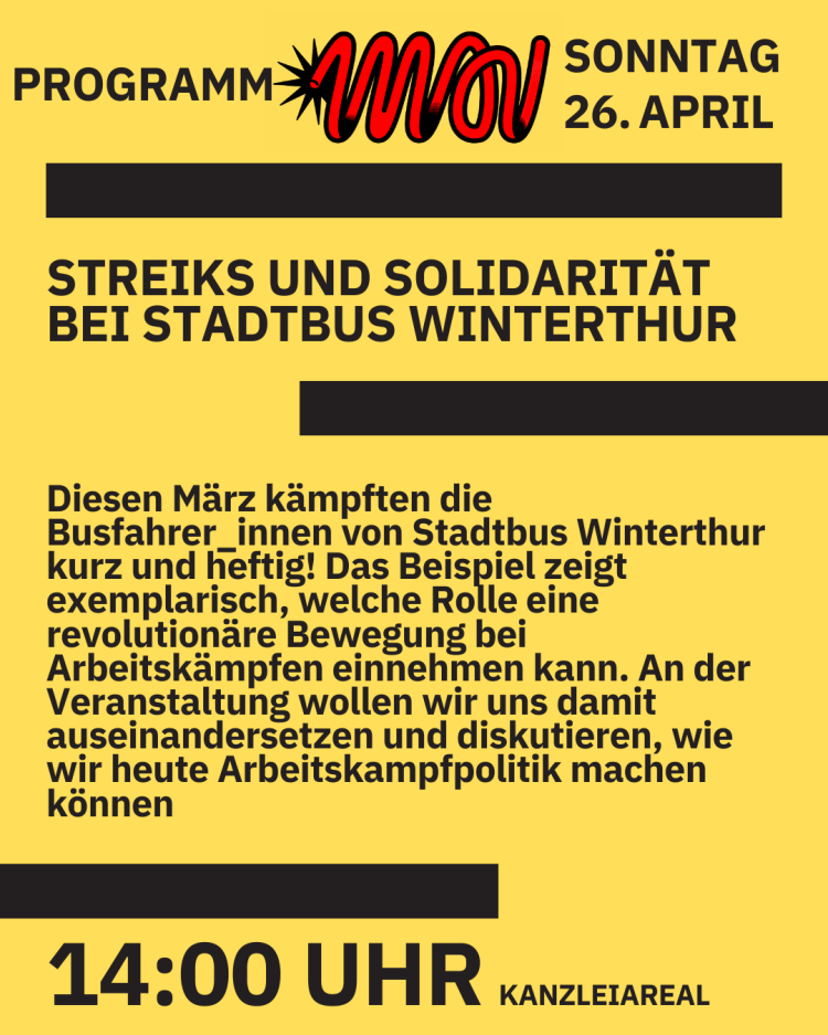 Diesen März kämpften die Busfahrer_innen von Stadtbus Winterthur kurz und heftig! Das Beispiel zeigt exemplarisch, welche Rolle eine revolutionäre Bewegung bei Arbeitskämpfen einnehmen kann. An der Veranstaltung wollen wir uns damit auseinandersetzen und diskutieren, wie wir heute Arbeitskampfpolitik machen können.