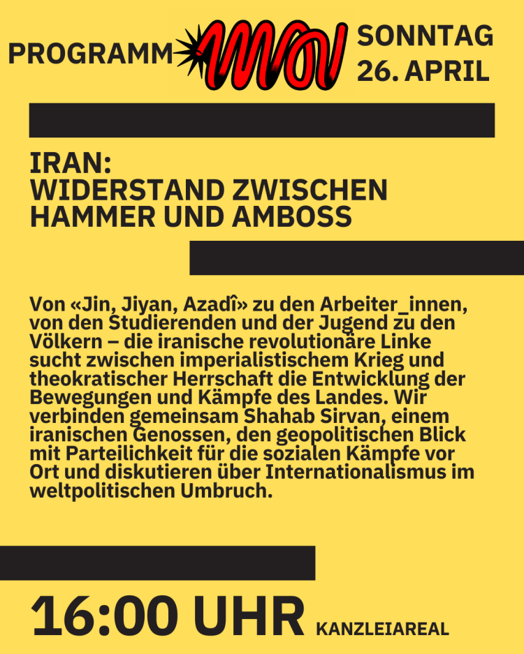 Von «Jin, Jiyan, Azadî» zu den Arbeiter_innen, von den Studierenden und der Jugend zu den Völkern – die iranische revolutionäre Linke sucht zwischen imperialistischem Krieg und theokratischer Herrschaft die Entwicklung der Bewegungen und Kämpfe des Landes. Wir verbinden gemeinsam Shahab Sirvan, einem iranischen Genossen, den geopolitischen Blick mit Parteilichkeit für die sozialen Kämpfe vor Ort und diskutieren über Internationalismus im weltpolitischen Umbruch.