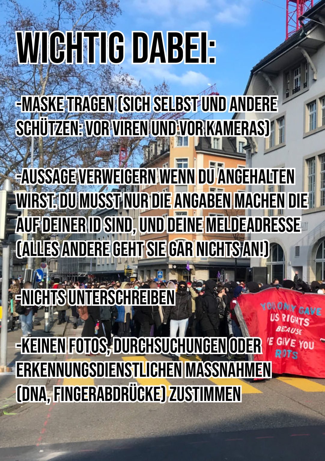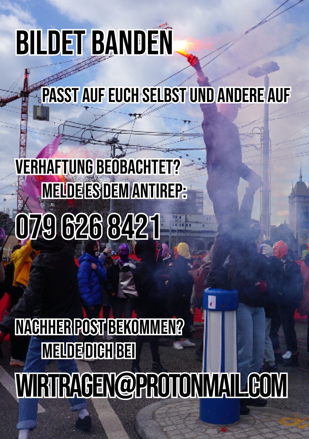 Wir sind in Kontakt mit Anwält:innen und der Roten Hilfe. Zudem gibt es auch immer wieder offene Treffen. Haltet euch über unseren Telegram Kanal (https://t.me/eurekrise ) und das wirtrageneurekrisenicht Instagram auf dem Laufenden.